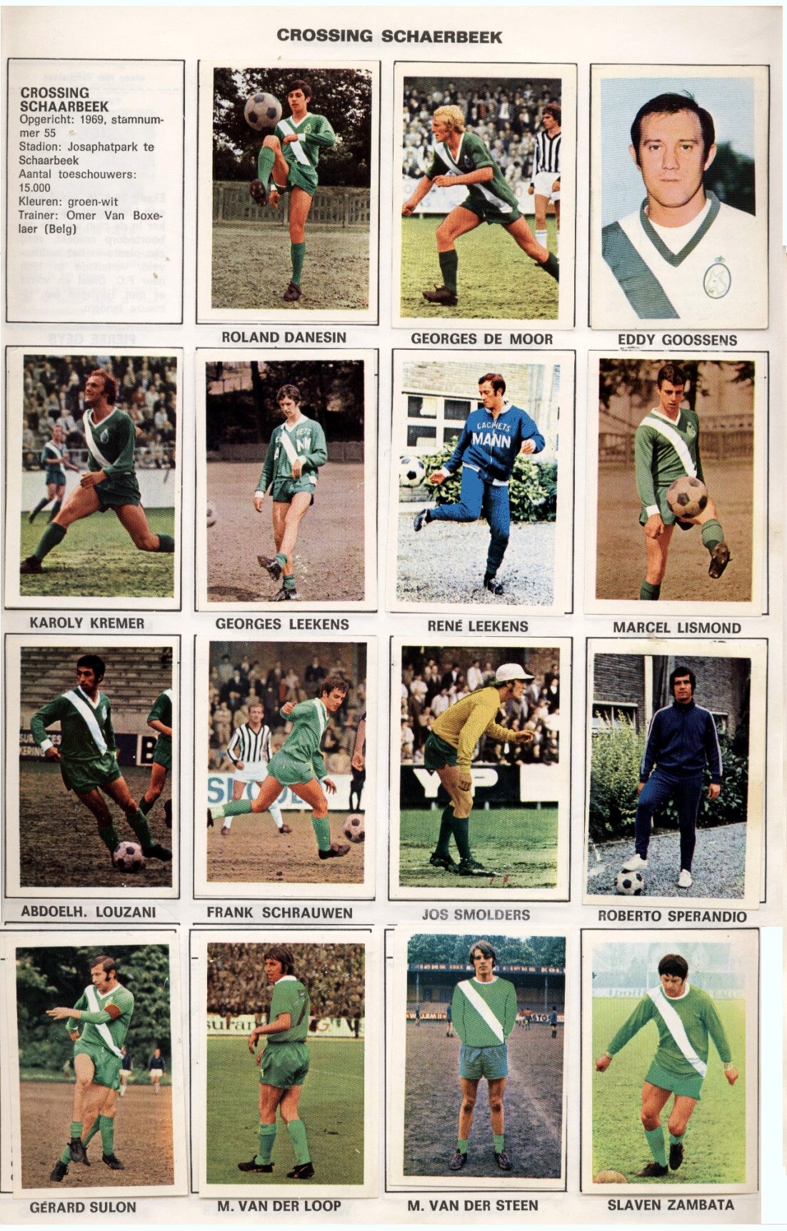 Cromos de la editorial VIU del Crossing Schaarbeek 1971/72, club belga desaparecido en 1991 al fusionarse con el VV Elewijt. Los cromos corresponden a una de las cuatro temporadas en las que el club estuvo en la máxima categoría.