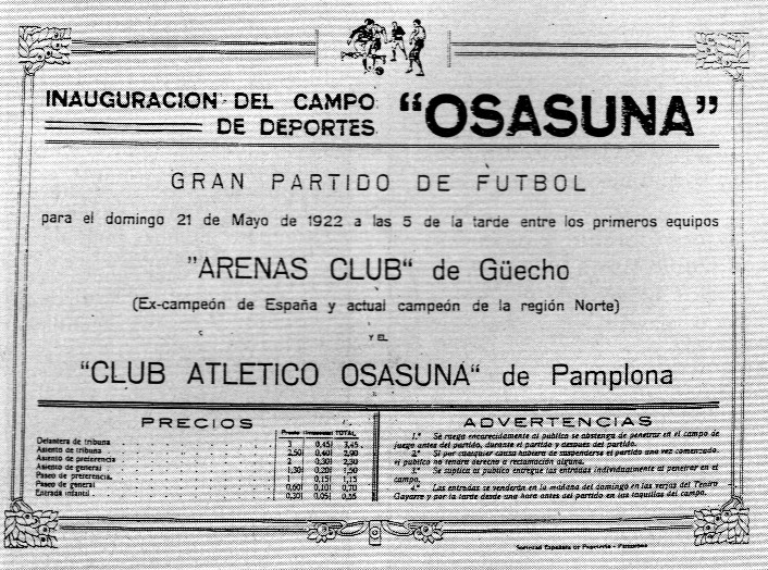 En febrero de 1921 el Club Atlético Osasuna formalizó el arriendo del terreno, para tras acondicionarlo y cerrarlo, inaugurar el campo de San Juan el 21-05-1922. El campo estaba situado a unos 600 metros del casco urbano de Pamplona, en lo que hoy es el Barrio de San Juan, y fue inaugurado con un partido entre el equipo local y el Arenas Club de Guecho. El equipo navarro, que se impuso por 2-0, formo con: Areta; Planas, Néstor; Pinillos, Goñi, Lusarreta; Idoate, Azagra, Urquizu, Echarren, y Zala.